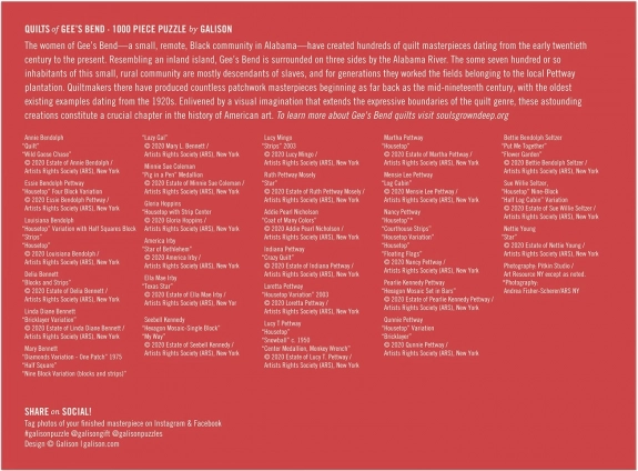 Dompel je onder in een visueel meeslepende collectie patchworkpatronen, geïnspireerd door het werk van de vrouwen uit Gee’s Bend in Alabama. Deze puzzel van 1000 stukjes biedt een combinatie van rijke kleuren en geometrische motieven, die samen een uniek beeld met hoge decoratieve waarde creëren.