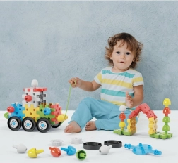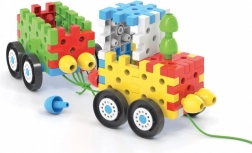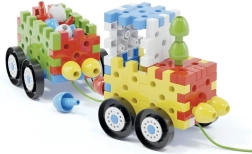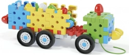 Bouw auto’s, huisjes en bomen van plaatjes en pinnetjes! Deze innovatieve bouwset bevat onderling koppelbare platte 3D-onderdelen en grote pinnetjes in verschillende kleuren, waarmee ook kleine kinderen allerlei autootjes, huizen, torens, bomen en veel meer kunnen maken. Tussen de in totaal 62 onderdelen zitten ook 8 wieltjes voor de onderstellen van de autootjes en 3 koordjes waarmee de autootjes kunnen worden voortgetrokken. Behalve verschillende autootjes maakt de set ook het bouwen van diverse vlakke en driedimensionale structuren mogelijk, waardoor bij kinderen van 2 tot 6 jaar de fijne motoriek, hand-oogcoördinatie en ruimtelijk inzicht worden geoefend en ontwikkeld, en tegelijk hun cognitieve ontwikkeling wordt gestimuleerd. Inhoud van de verpakking: 20 onderling koppelbare platte 3D-onderdelen, 16 onderling koppelbare pinnetjes, 8 wieltjes, 3 koordjes om autootjes te trekken. Belangrijkste kenmerken: ontwikkelt fijne motoriek, creativiteit, fantasie en logisch-combinatorisch denken; verpakking bevat 52 onderdelen; voor kinderen vanaf 2 jaar. Afmetingen verpakking: 40x34x9 cm. Leeftijd: 2+. Materiaal: plastic. Bevat 62 onderdelen.