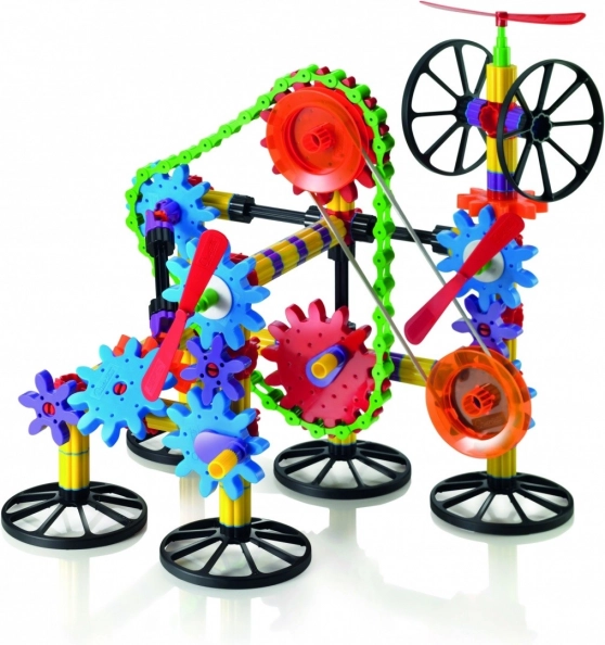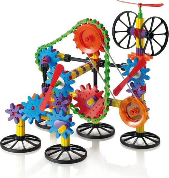 Kleurrijke componenten, staafjes, wielen en tandwielen maken het mogelijk om eenvoudige en complexe modellen te creëren. De fantasie kent geen grenzen.