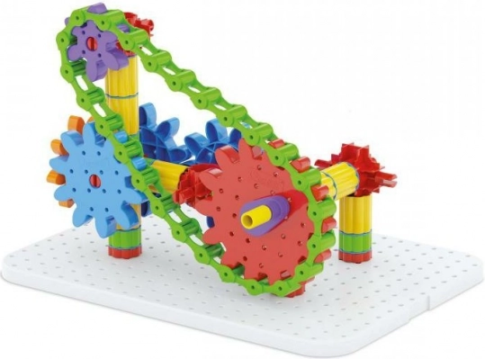 De bouwdoos is gemaakt van duurzaam plastic en is ontworpen voor kinderen vanaf 5 jaar. Het bevat componenten zoals een witte basisplaat, tandwielen van verschillende formaten, een ketting en nog veel meer, waardoor kinderen een nieuwe wereld van mechanische bewegingen kunnen ontdekken.