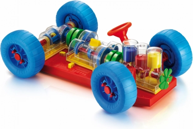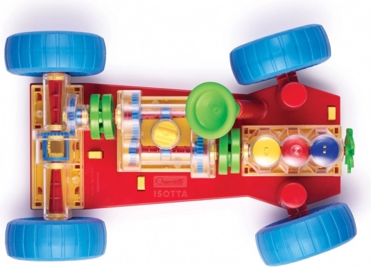 Een ingenieus speelgoed dat kinderen en hun ouders uitnodigt om te ontdekken hoe een echte auto werkt. Alle basismechanische functies zijn hier nauwkeurig gereproduceerd. Bij de motor zien kinderen hoe de cilinders en de krukas werken en hoe deze verbonden zijn met de versnellingsbak, die een werkende schakeling met 3 standen heeft (neutraal, 1e en 2e versnelling). Het differentieel brengt de beweging over op de achterwielen en maakt het mogelijk dat ze onafhankelijk van elkaar draaien. Alle mechanische onderdelen kunnen eenvoudig aan het chassis worden bevestigd en net zo gemakkelijk worden losgemaakt met speciale geveerde gele knopjes. Het stuur werkt en maakt het mogelijk de auto te laten sturen of in te parkeren. Kinderen kunnen de auto ook aan de voor- en achterzijde optillen met speciale verrijdbare steuntjes en door aan de slinger van de voorste te draaien de hele mechaniek in beweging zetten. Bij het schakelen van de verschillende versnellingen zien ze hoe de snelheid van de wielen en de cilinders verandert. In de neutraalstand merken ze ook hoe de motor en het differentieel van elkaar worden losgekoppeld. Geschikt voor kinderen vanaf 3 jaar. Belangrijkste kenmerken: basismechanische functies zijn gereproduceerd, werkend stuur en mechanische onderdelen, voor kinderen vanaf 3 jaar