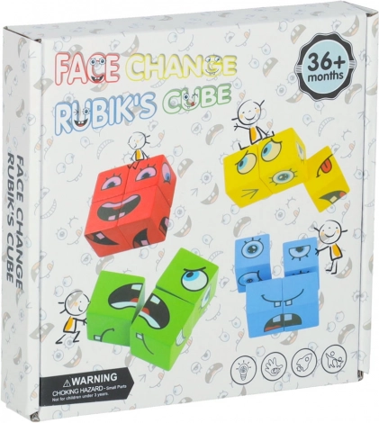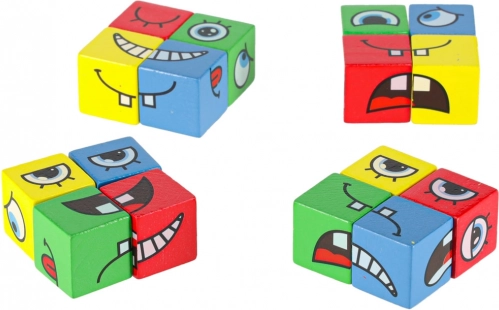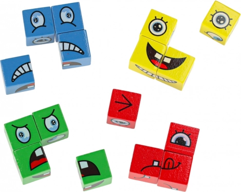 Glad geschuurde blokjes met opdruk van ogen en monden maken het mogelijk om tientallen uitdrukkingen te vormen. Stevig, veilig en prettig in de hand.