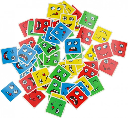 - 16 houten blokjes in 4 kleuren, 64 kaarten met uitdrukkingen