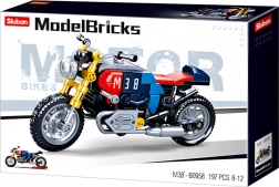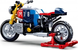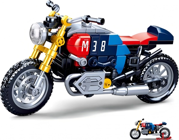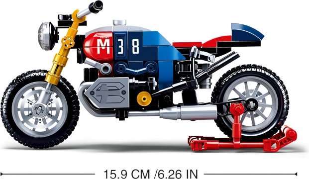 Dit gedetailleerde motormodel in de iconische cafe racer-stijl biedt een aansprekende combinatie van blauw, rood en geel met het prominente nummer 38. Realistische elementen, zoals functionele wielen en uitlaten, maken het een aantrekkelijke motor-bouwset om mee te spelen én om neer te zetten.
