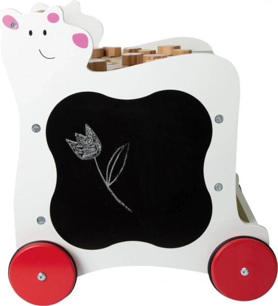 Dankzij de gerubberde wielen is de beweging stil en vriendelijk voor alle vloertypen. Bovendien biedt de loopwagen opbergruimte voor blokken en kleine spulletjes, zodat de speelhoek snel is opgeruimd.