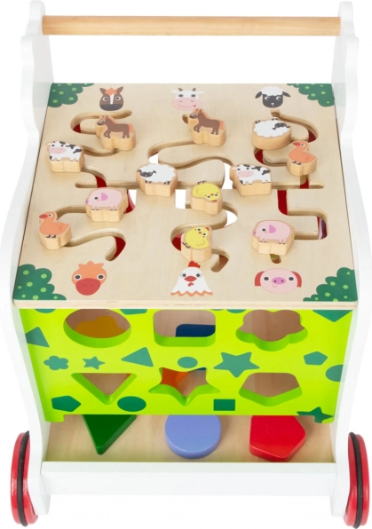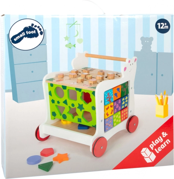 Ontdek de wereld stap voor stap. Deze duurzame loopwagen van multiplex en massief hout helpt kinderen veilig balans en coördinatie te oefenen, terwijl de geïntegreerde activiteiten – vormstoof met 6 stukjes, doolhof en draaibare blokken – het visuele waarnemen en logisch denken versterken. Het krijtbord voegt een creatieve dimensie toe aan leren en spel.