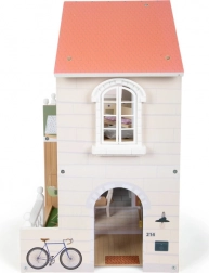 Stijlvol houten poppenhuis met een open voorkant, met drie kamers, een terras en een tuintje voor realistisch spel. Inclusief spiraalvormige trap, openende ramen, moderne badkamer met plexiwand en 8 stuks functioneel meubilair met textiele accessoires. Compact en stabiel uitgevoerd in een licht, modern design, ideaal voor de kinder- én woonkamer.