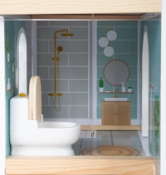 Inclusief 8 stuks meubilair en praktische details voor authentiek spel: openend toilet, keukenkastjes en koelkast met deurtjes en laden. Textiele kussens en beddengoed geven de slaapkamer warmte, terwijl de spiraalvormige trap de twee verdiepingen verbindt met een doordacht interieur en een plexi douchewand.