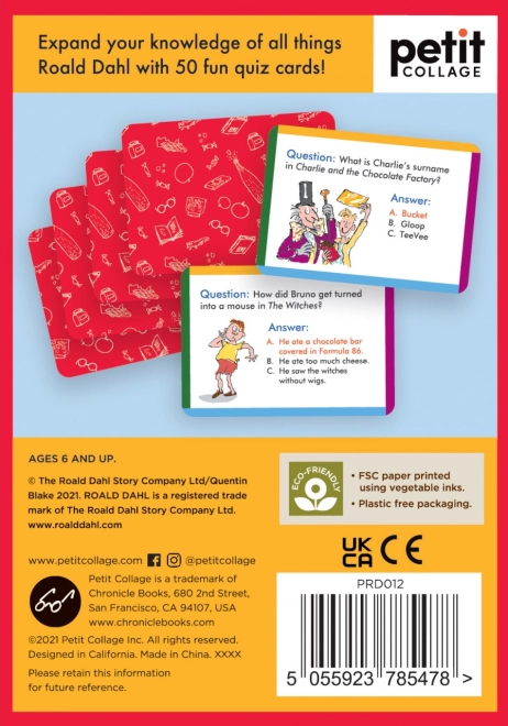 Word een meester in de verhalen van Roald Dahl dankzij quizkaarten die je geheugen en kennis testen. Ze bevatten 50 kaarten met vragen die jou en je familie geweldige entertainment bieden thuis of onderweg. Dankzij de illustraties van Sir Quentin Blake zijn de kaarten ook aantrekkelijk voor het oog. Gemaakt van 100% FSC-gecertificeerd papier en bedrukt met plantaardige inkten, voldoen ze aan strenge ecologische normen.< /p>
