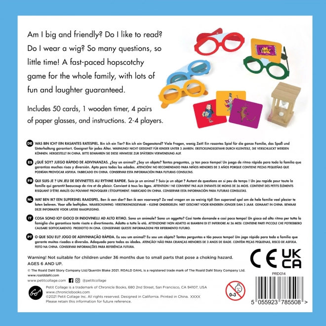"Wat is het? Spel met Roald Dahl-thema's" van Petit Collage trekt je in een magische wereld van literaire personages met grappige brillen en geïllustreerde kaarten. In dit leuke spel kunnen spelers hun kennis van geliefde personages testen door middel van vragen en antwoorden. Het spel is ontworpen voor 2-4 spelers en is ideaal voor familiebijeenkomsten.