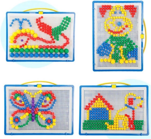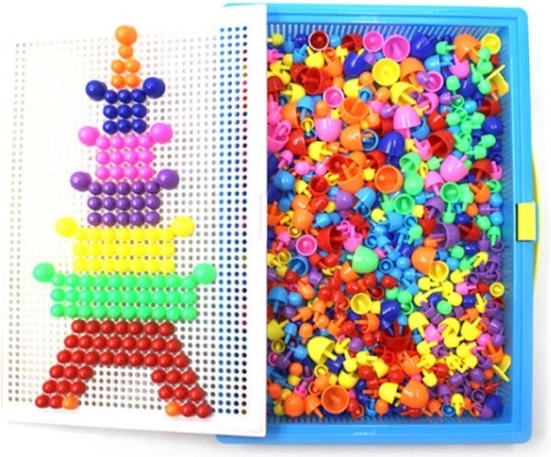 Dit speelgoed is geliefd bij generaties kinderen en wordt nostalgisch herinnerd door volwassenen. Eenvoudige constructie bestaande uit gekleurde plastic paddenstoeltjes in verschillende groottes en een geperforeerde basisplaat voor het insteken ervan. Alles is opgeborgen in een compacte koffer, zodat uw kind zijn favoriete speelgoed overal mee naartoe kan nemen.