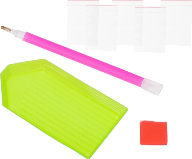 De set bevat alles wat je nodig hebt om een stralend kunstwerk te maken: afbeelding, kleurrijke steentjes, applicator, droog lijm en een dienblad.