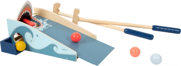 Verander elke kamer of tuin in een mini-golfbaan! De houten minigolf met haaienbek biedt kinderen actieve fun en training van de grove motoriek, oog-handcoördinatie en geduld. Laat het balletje over de blauwe helling als over een golf naar de open bek rollen – bij een treffer sluit de haai zijn bek en vier jij je score.