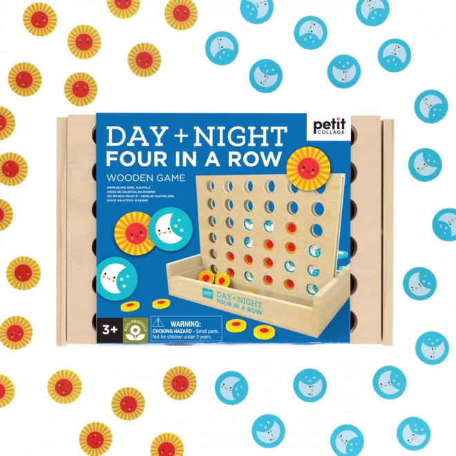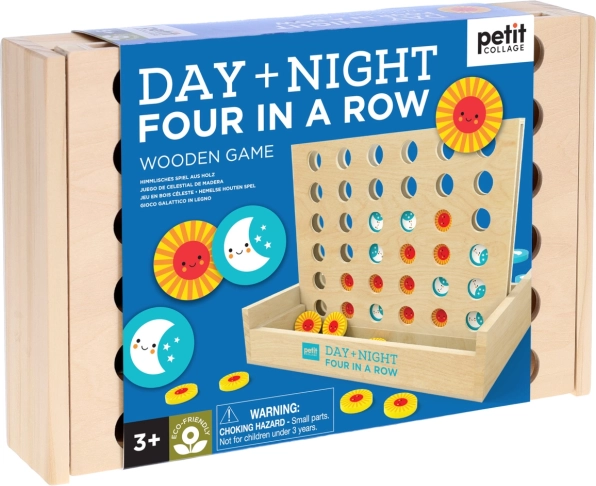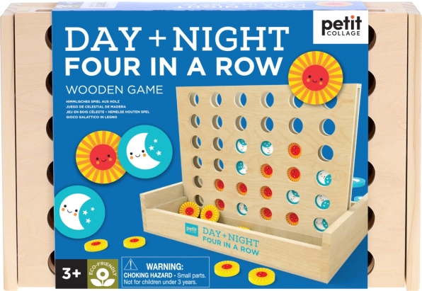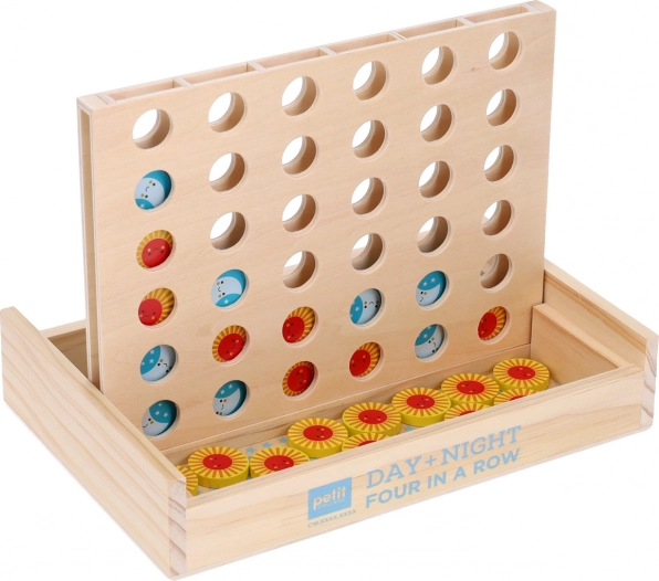 Houten spel Vier op een rij dag en nacht vereist van spelers niet alleen snel denken, maar ook strategische planningsvaardigheden. Het doel is om vier speelstukken op een rij op het rooster te plaatsen. De stukken hebben een aantrekkelijke zon en maan design die zowel jonge als volwassen spelers boeit en verheugt.