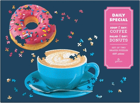 Ontdek een originele 2-in-1 puzzelset die liefhebbers van zoete motieven en koffie zal bekoren. In de verpakking vind je twee losse puzzels: een roze donut en een kopje cappuccino. Dankzij de onregelmatig gevormde stukjes is puzzelen leuk en boeiend, en de eindresultaten zijn perfect om tentoon te stellen.