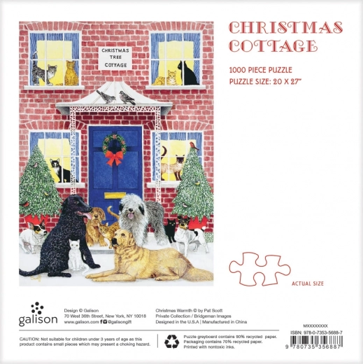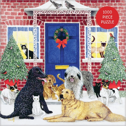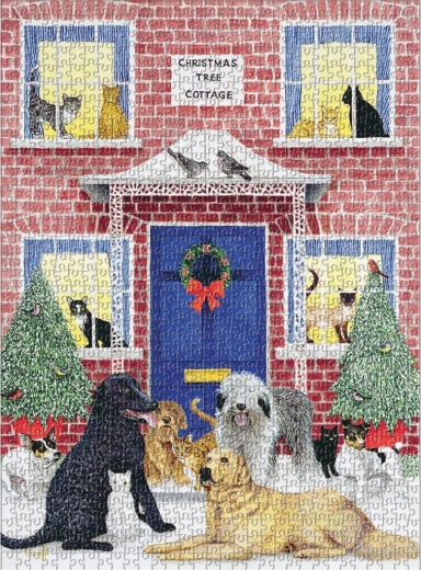 Het motief “Christmas Tree Cottage” met speelse honden en katten brengt een feestelijke sfeer en plezier in huis tijdens het puzzelen.