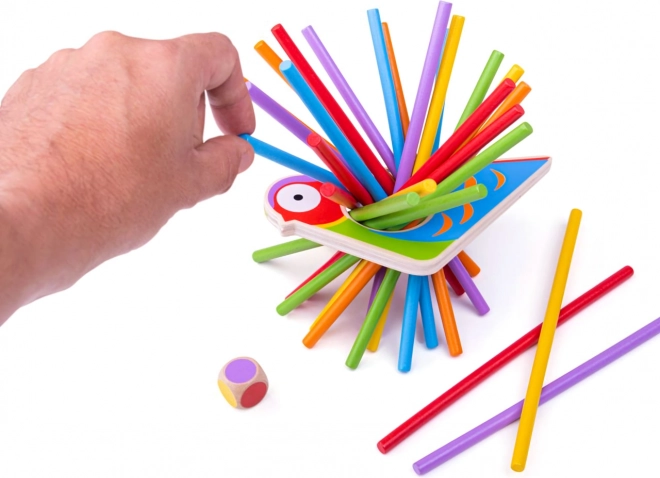 Dompel uzelf onder in de wereld van plezier met dit speelse spel, dat niet alleen fijne motoriek en concentratie ontwikkelt, maar ook geduld en strategisch denken. Het kleurrijke houten balansspel bestaat uit een prachtig vervaardigde houten papegaai als basis en levendige stokjes om op te stapelen. Spelers kunnen de dobbelsteen gooien en hun volgende zet bepalen, wat een element van toeval en spanning aan het spel toevoegt. Het hoofddoel van het spel is eenvoudig, maar biedt urenlang plezier voor het hele gezin. Het spel is ideaal voor kinderen die er nieuwe vaardigheden mee kunnen leren in de vorm van spel.