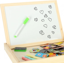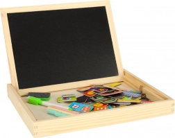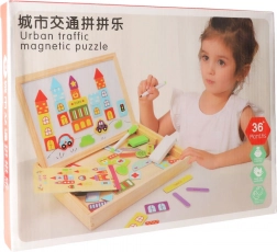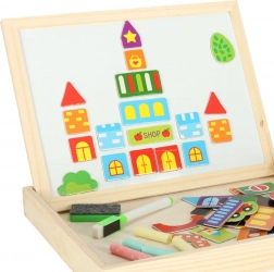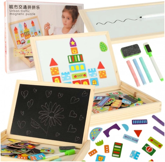 Het bord heeft twee werkvlakken: een witte magnetische zijde voor het samenstellen van afbeeldingen met magneetstukjes en schrijven met een droog uitwisbare stift, en een zwarte krijtzijde voor tekenen met krijt. Het thema stad stimuleert verhalend spel en het leren van kleuren, vormen en de basis van ruimtelijke planning.