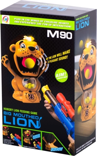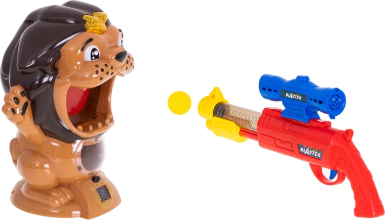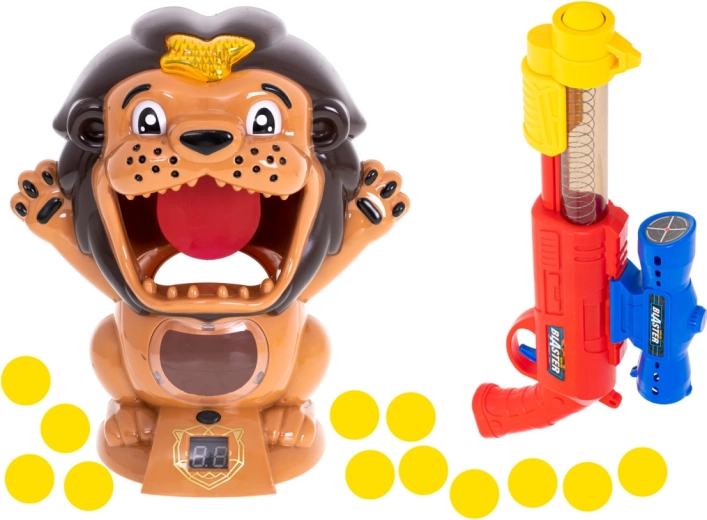 Gooi het balletje precies in de bek en word koning van de jungle! Het interactieve doel in de vorm van een leeuw beloont een zuivere treffer met de karakteristieke brul en telt punten op het digitale display. De handmatige blaster met veermechanisme en richtvizier bovenop maakt richten makkelijker, de zachte schuimballetjes zijn mild en veilig voor spel in de kinderkamer.
