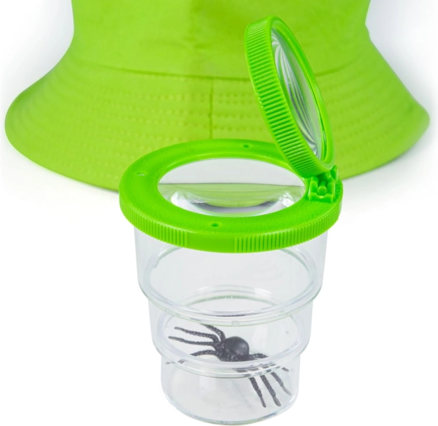 De loep en het doorzichtige potje met deksel laten kinderen details van heel dichtbij onderzoeken, met respect voor de natuur.