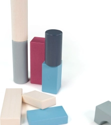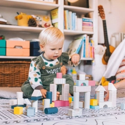 Deze tijdloze houten bouwset biedt kinderen eindeloze bouwmogelijkheden – van eenvoudige torens tot kleine architectonische juweeltjes. De blokken zijn ontworpen om perfect in kleine handjes te passen en dankzij de afgeronde randen en het gladde oppervlak zijn ze gemakkelijk en veilig vast te pakken. De diverse vormen en kleuren stimuleren creativiteit, ruimtelijk inzicht en de eerste logische verbanden.