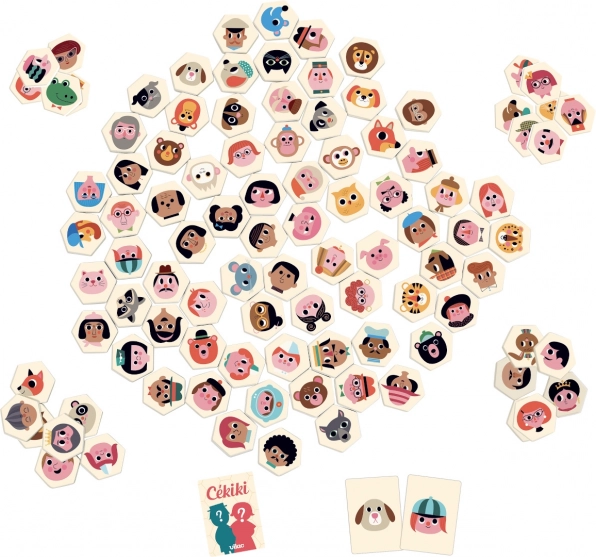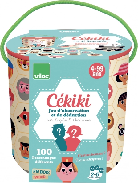 VILAC CÉKIKI is een vlot observatie- en raadspel met originele personages van de Zweedse illustratrice Ingela P. Arrhenius. Leg de houten tegels met afbeeldingen op tafel en probeer twee speelwijzen: stel slimme ja/nee-vragen om het geheime personage te raden, of zoek zo snel mogelijk de overeenkomstige afbeelding bij de omgedraaide kaart.