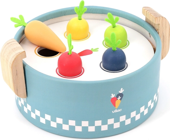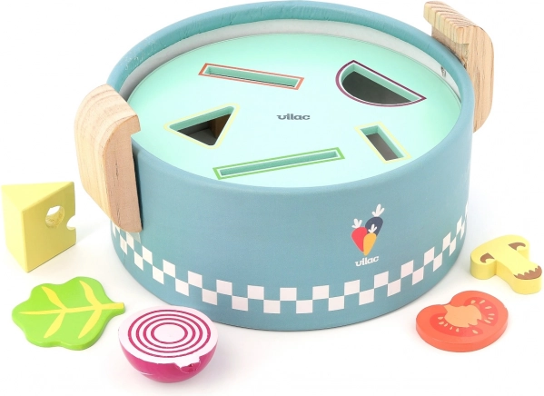 De VILAC insteek mini pot is een slimme houten speelset voor de allerkleinsten vanaf 18 maanden. Onder het deksel zitten drie verwisselbare platen met verschillende vormen, waarin kinderen kleurrijke voedselstukjes plaatsen of laten vallen. Zo ontstaat “koken” als in het echt, wat de fantasie en praktische vaardigheden stimuleert.
