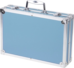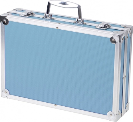 Metalen-kunststof koffer met stevig handvat en sluitingen houdt alles veilig bij elkaar. Makkelijk mee te nemen naar school, club of vakantie.