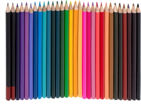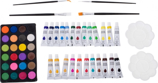 - 33× stift, 28× kleurpotlood, 4× penseel, 2× potlood, 2× gum, 2× kunststof paletje, 1× puntenslijper, palet met 24 aquarellen, 24× verftube, 24× oliepastel, koffer