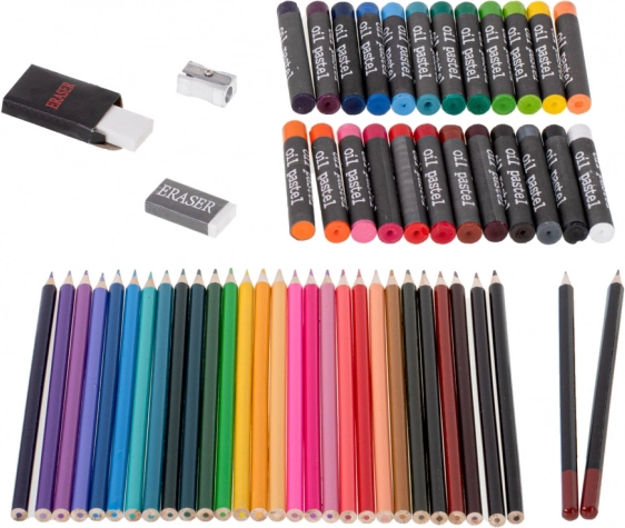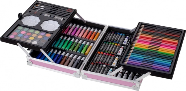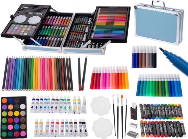 - Complete uitrusting, 145 stuks: stiften, kleurpotloden, penselen, potloden, gum, aquarellen, verftubes, oliepastels, paletjes en puntenslijper.