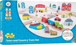 Een complete stads- en dorpsscène met brug, overgang, gebouwen, bomen en figuurtjes biedt kinderen volop inspiratie om te spelen en hun fantasie te ontwikkelen.