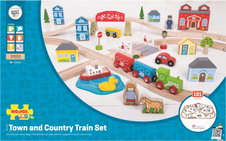 Ontdek de betovering van de wereld op rails met deze rijk uitgeruste houten treinbaan van BIGJIGS RAIL. De set bestaat uit 91 onderdelen, bevat een brug, een spoorwegovergang, kleurrijke gebouwen en bomen en is volledig compatibel met andere houten spoorbanen. Gemaakt van hoogwaardige, duurzame materialen, voldoet aan de Europese veiligheidsnormen en stimuleert de verbeelding, behendigheid en coördinatie van kinderen vanaf 3 jaar.