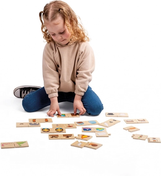 Kinderen combineren afbeeldingen die bij elkaar horen als tegengestelden – bijvoorbeeld dag en nacht, warm en koud, verdrietig en vrolijk. De gladde, robuuste stukjes liggen goed in de hand en zijn gemakkelijk te plaatsen, zodat kleine handjes zich kunnen richten op het ontdekken van nieuwe woorden en verbanden.