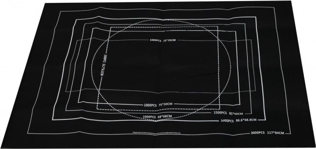 Witte omlijningskaders op de mat tonen de aanbevolen oppervlakte voor 500 tot 3000 stukjes, zodat je altijd weet hoeveel ruimte je nodig hebt.
