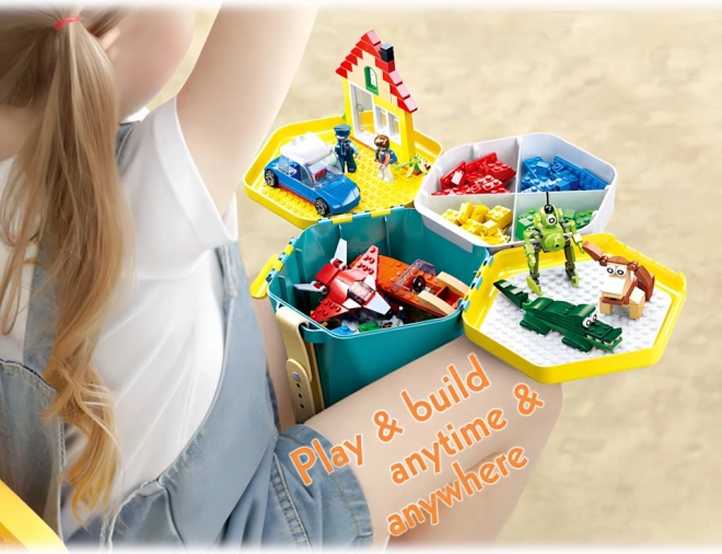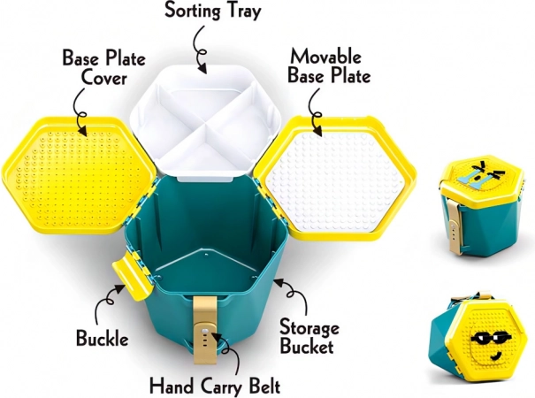 - Praktische emmer – het deksel dient als bouwplaat en binnenin zit een vak voor overzichtelijke sortering van de onderdelen.
