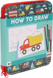 Duidelijke en begrijpelijke stappen leren kinderen 36 verschillende voertuigen tekenen – van fietsen en auto's tot ballonnen en boten.