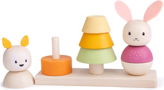 Dit hoogwaardige houten stapelspeelgoed van BIGJIGS BABY biedt kinderen vanaf 12 maanden veel plezier én leerwaarde. Drie afzonderlijke pennen met een flexibele verbinding maken het eenvoudig en veilig om de onderdelen te plaatsen: op de zijpennen bouw je de vos en het konijntje, op de middelste pen een gestileerde den. Zachte pasteltinten en prettige vormen nodigen uit tot ontdekken, sorteren en bouwen.