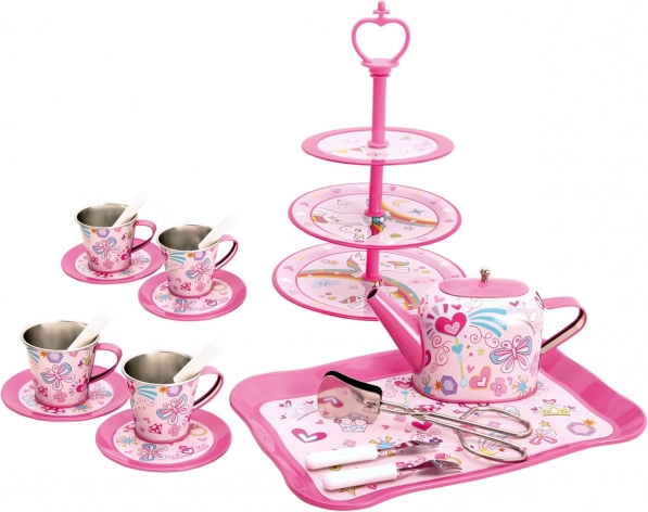 Compleet servies met theepot, kopjes, schoteltjes, dienblad en een etagère voor lekkernijen – alles voor een realistische theeparty.