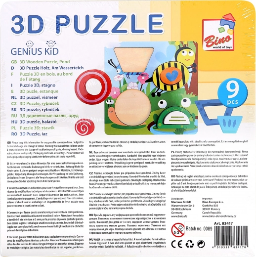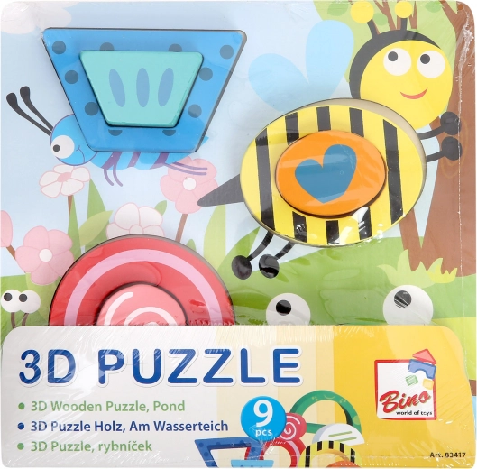 Ontdek het leuke houten 3D-puzzel met vijverthema van Bino, dat de fantasie en vaardigheden van kinderen stimuleert. Dankzij de stevige basis en 8 kleurrijke stukjes oefenen kinderen vormherkenning, fijne motoriek, logisch denken en concentratie. De veilige uitvoering van massief hout en dik multiplex met ongevaarlijke verven en lakken zorgt voor een lange levensduur en comfortabel gebruik.