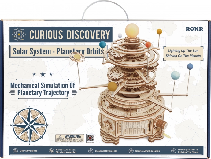 Dit gedetailleerde houten model van het zonnestelsel combineert bouwplezier met slimme mechanica. Dankzij het doordachte tandwielsysteem simuleert het ORRERY-mechanisme de verschillende omloopsnelheden van de planeten rond het middelpunt – de zon met LED-verlichting, die oplicht wanneer je handmatig aan de slinger draait.