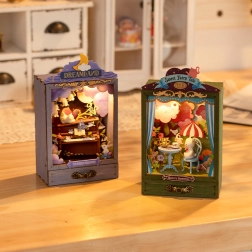 Dit betoverende miniatuur diorama laat je onderdompelen in een fantasiewereld. Binnenin de kast bevindt zich warm licht dat een magische diepte aan de scène geeft. Een praktische lade in de onderkant van de kast maakt het mogelijk kleine voorwerpen op te bergen. De montage omvat het werken met multiplex en kartonnen onderdelen, die eenvoudig te bereiden zijn. De elektrische componenten zijn vooraf gemonteerd, wat de installatie vergemakkelijkt. Je hebt alleen een schaar nodig, aangezien de andere gereedschappen inbegrepen zijn.