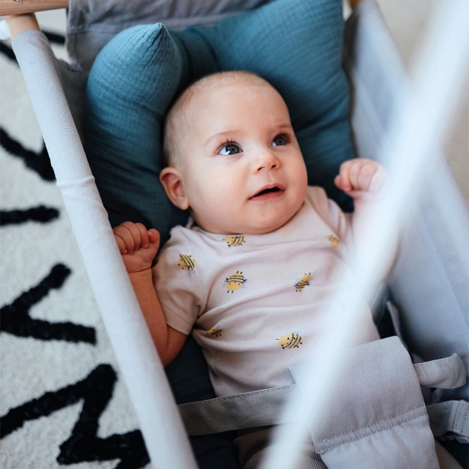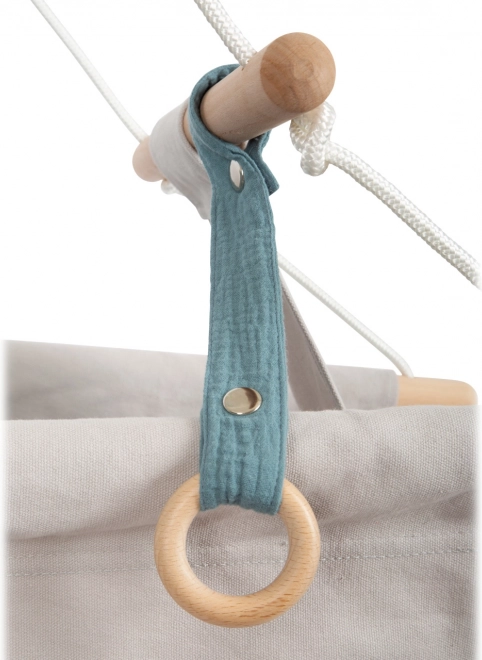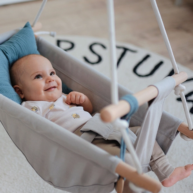 De schommel voor de allerkleinsten Zee biedt uitstekend comfort voor uw kind. Het is uitgerust met een zacht, afneembaar kussen, bevestigd met lussen, en een driepunts gordel voor maximale veiligheid. Het ontwerp in rookblauwe kleur in perfecte harmonie met zorgvuldig bewerkt massief hout voegt charme toe aan elke kamer of tuin.