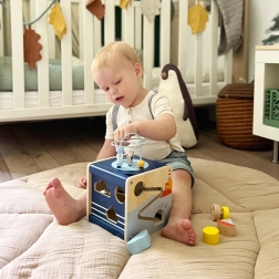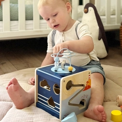 De kubus is niet alleen educatief, maar past dankzij contrasterende kleuren en natuurlijk hout ook bij ieder kleurenschema. Het afneembare deksel bespaart ruimte.