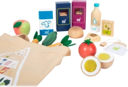 Dankzij de katoenen tas met opdruk van de voedselpiramide leren kinderen spelenderwijs over juiste voeding, ecologie en verantwoord winkelen. De duurzame afwerking van hout en textiel ligt prettig in de hand en is ideaal voor kinderkeukens en marktkraampjes. De set is compatibel met andere producten uit de “Fresh”-lijn.