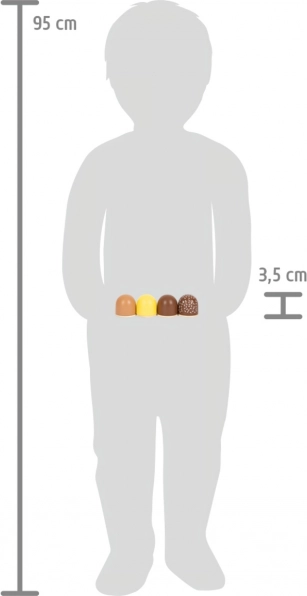 Vier soorten pralines - witte chocolade, donkere chocolade, donkere chocolade met strooisel en melkchocolade - verfrissen kinderspelletjes op een aangename manier. Hun natuurlijke uitstraling en eco-vriendelijke kartonnen verpakking zijn ontworpen om kinderen te inspireren en te enthousiasmeren voor fantasierijk spel.