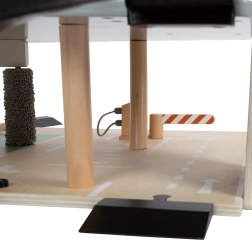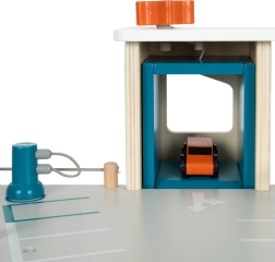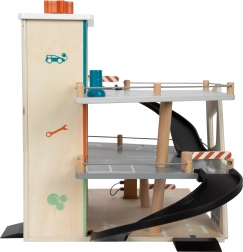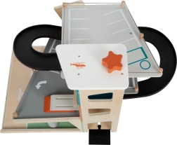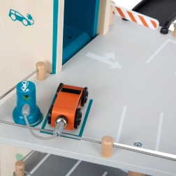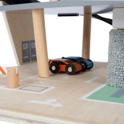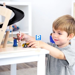 Deze design houten raceparkeerplaats biedt kinderen een rijk uitgerust speeluniversum. Drie verdiepingen zijn verbonden met een werkende lift en twee vloeiende hellingen die de autootjes soepel laten bewegen. Elk niveau heeft een mechanische slagboom en een rubberen rand die voor dynamiek zorgt en voorkomt dat voertuigen uit de bocht vliegen. Kleurrijke pictogrammen en verkeersborden stimuleren spelenderwijs leren en prikkelen de verbeelding.
