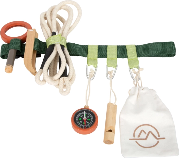 Ga op onvergetelijke avonturen met een riem vol uitrusting. Kinderen zullen enthousiast zijn over de duurzame riem, die een houten fluit, een vergrootglas, een pincet, een kompas, een touw en een stoffen zakje bevat. Alles is eenvoudig te bevestigen met behulp van oogjes en karabiners.
