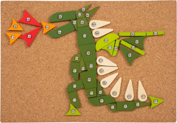 De set bevat een kurken onderlegger, een houten hamer, gekleurde stukjes en punaises om afbeeldingen te maken.