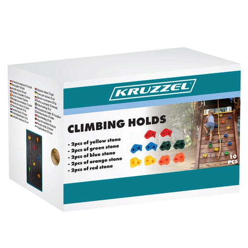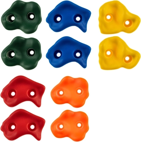 Breid de speelplek voor kinderen uit met veilige en duurzame klimgrepen die motiveren tot beweging en plezier in de buitenlucht. De set van 10 stuks in contrasterende kleuren (rood, geel, groen, blauw, oranje) vergemakkelijkt het plannen van routes en ondersteunt visuele oriëntatie.