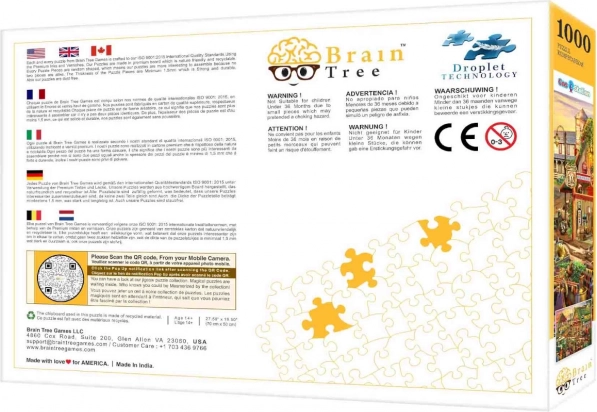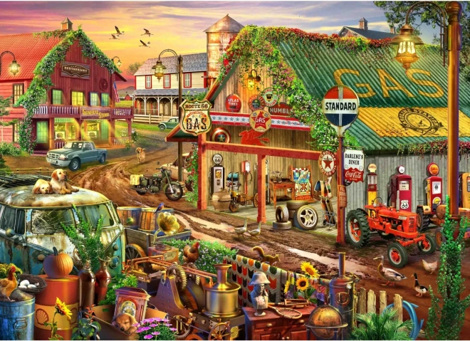 Stijlvolle Brain Tree-puzzel met een landelijke tankstationscène, met 1000 uniek gevormde stukjes, een matte afwerking met premium print en rijkelijke accessoires voor comfortabel puzzelen. Geniet van gevarieerde stukvormen, een poster in puzzelkwaliteit, praktische sorteervakken, een dekselstandaard en een duurzame hersluitbare zak ter bescherming van de stukjes.